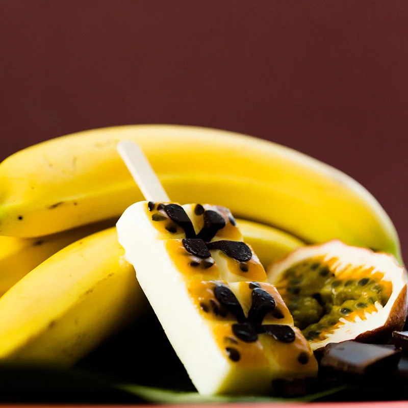 Banana gelato topped with passion fruit and chocolate. Our signature flavor, an explosion of tropical delight in every bite.